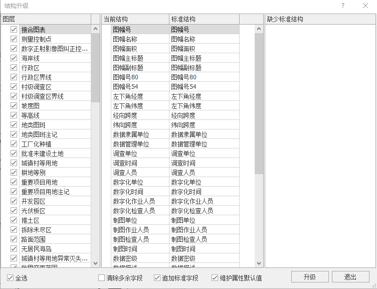 解决方法:将所有图层进行数据库结构升级功能操作,建议按照如下勾选。