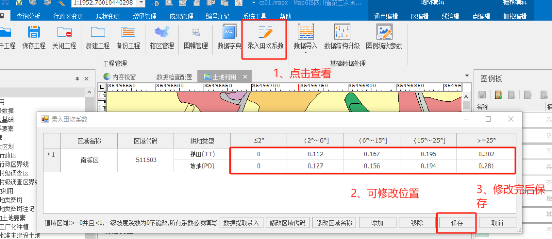 MapGIS一键建库完成后大家一定去检查下田坎系数对应的值是不是正确三调标准田坎系数。因为很多区县做过土整田坎系数入库,导致很多田坎系数成为了非标准田坎系数,软件自动提取时无法完全区分标准田坎系数,大家一键建库完成后,通过点击工具栏“录入田坎系数”工具核对系数,核对不正确的可手动修改并保存。如图: