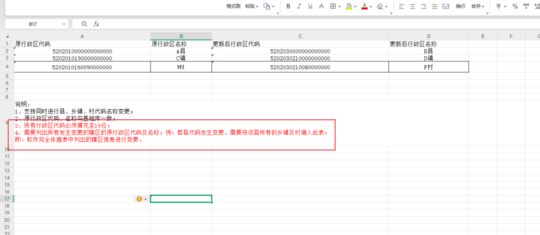 4)需要列出所有发生变更的辖区的原行政区代码及名称;例:若县代码发生变更,需要将该县所有的乡镇及村调入此表;