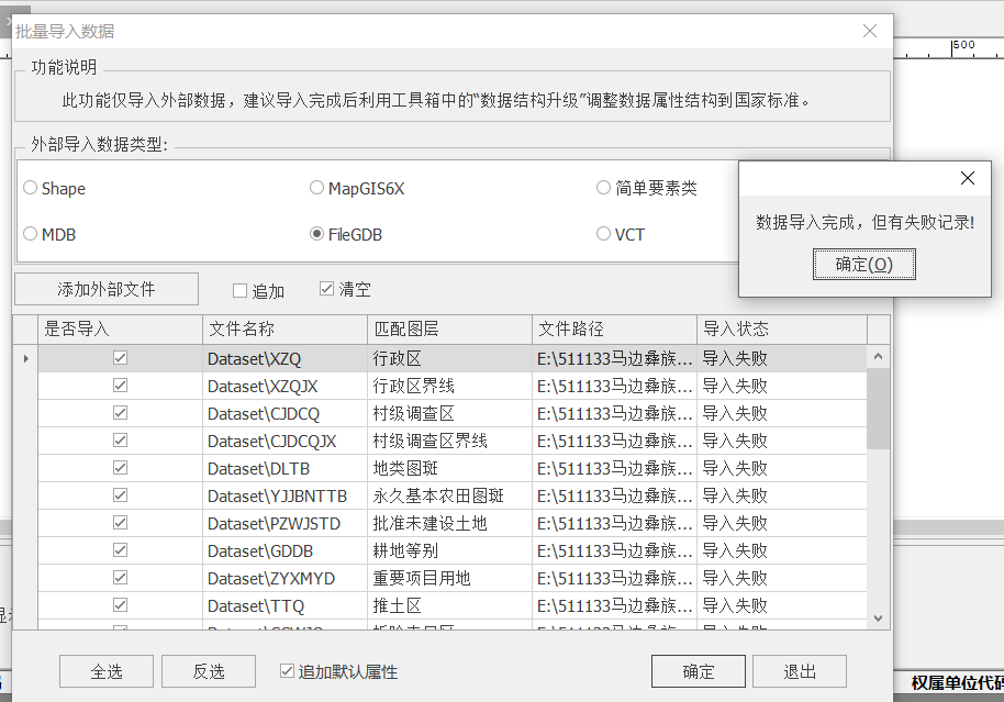 解决方法:1)可将GDB数据库中涉及图层的属性字段修改为标准类型和长度,如“备注”字段,长度改为254,然后再去导入即可;2)可将GDB数据中图层导为shp格式再去进行导入。