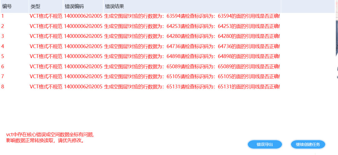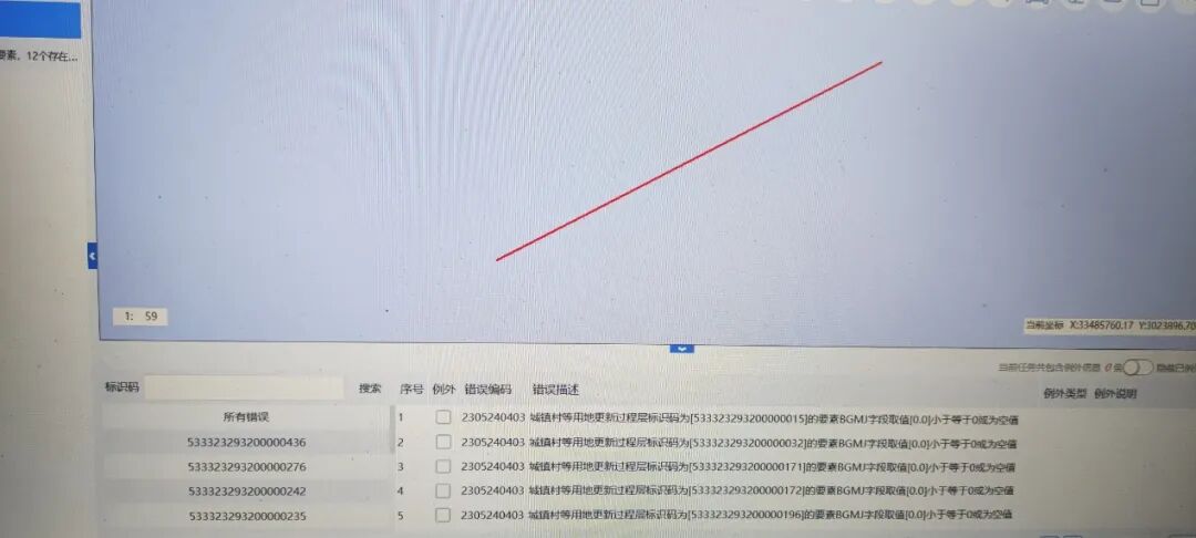 上图中绿色部分为图层名称,黄色为内部标识码即质检软件提示的标识码,红色部分为数据标识码,根据图层名称和标识码去系统中找对应图元。(可在群里下载:如何查找导入质检软件vct生成空图层的报错.mp4。视频文件按照方法查找)