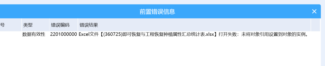 11、前置错误信息:数据有效性2201000000Excel文件【(XXXXXX)即可恢复与工程恢复种植属性汇总统计表.xlsx】打开失败:未将对象引用设置到对象的实例。