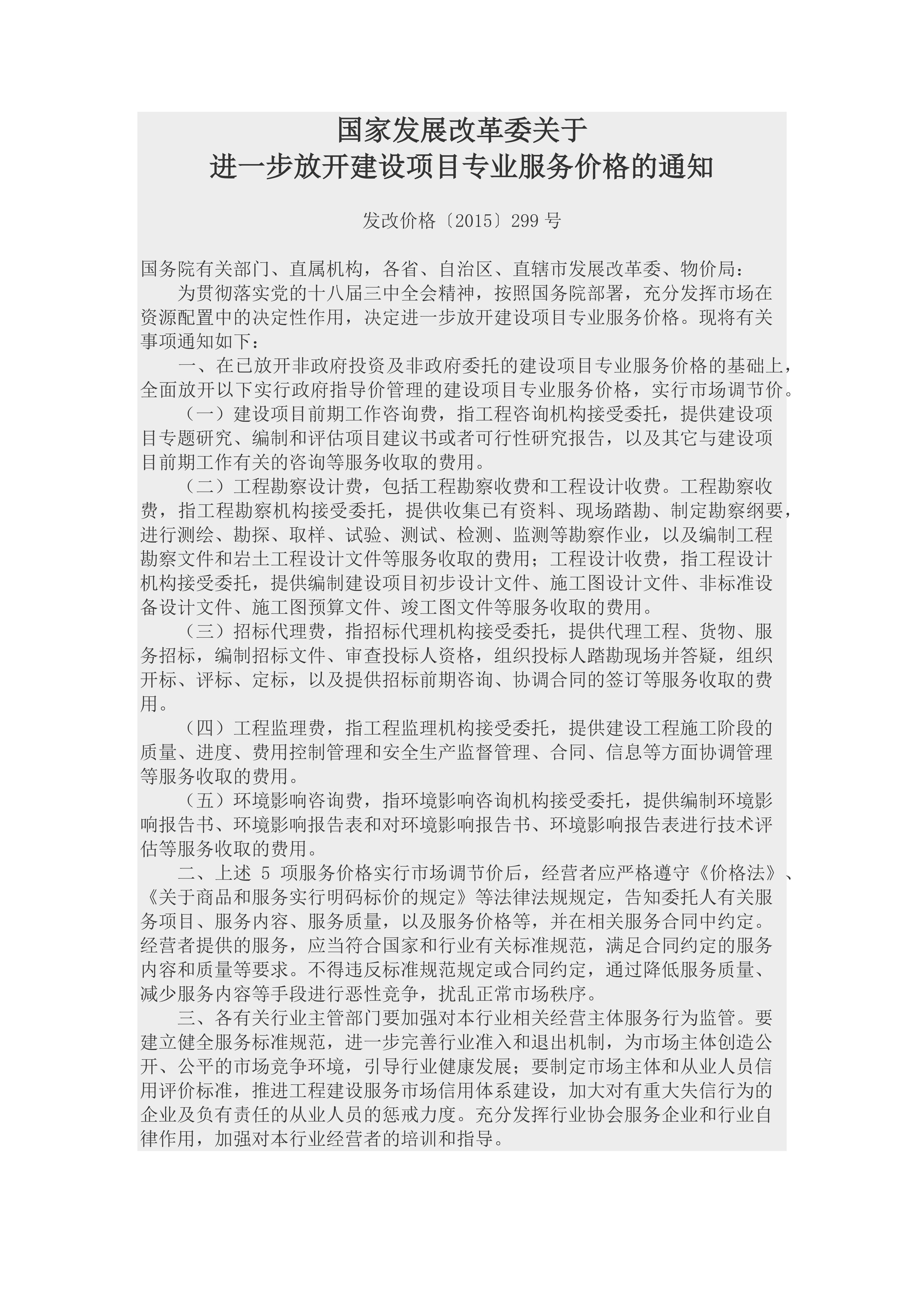 关于进一步开放建设项目专业服务价格的通知(发改价格[2015]299号)