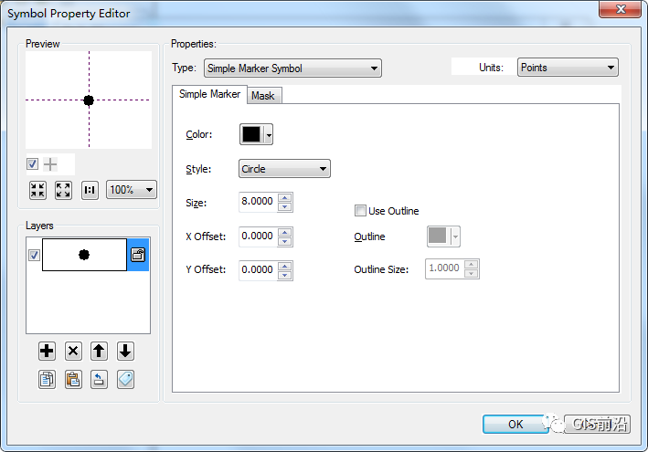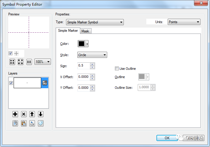 2、查看地形图图示中高程点参数。打开ArcGis符号编辑器,“类型”选择简单标记符号,单位设置为毫米。设置大小为0.5,点击颜色右侧向下箭头弹出颜色选择对话框原则更多选择“CMYK”颜色模式设置K值为100,点击“确定”设置符号名称为“高程点”,类别为“地貌”;
