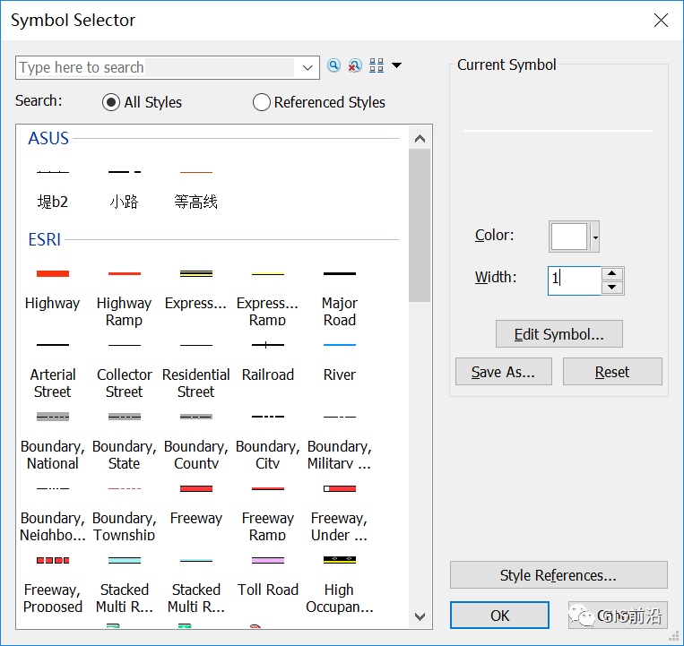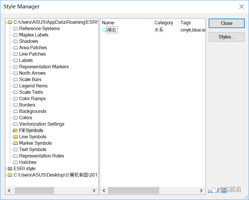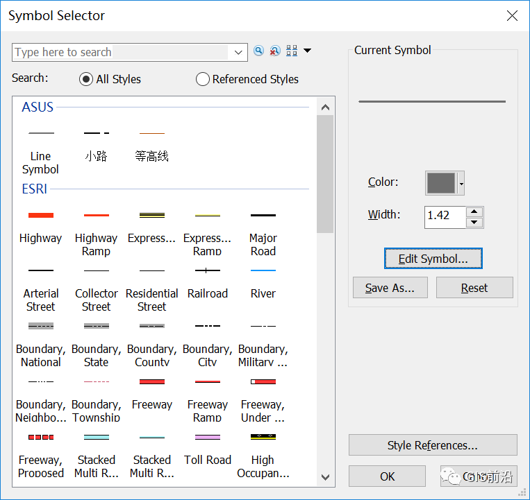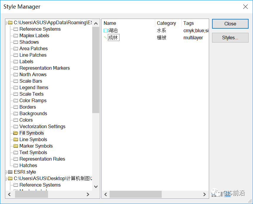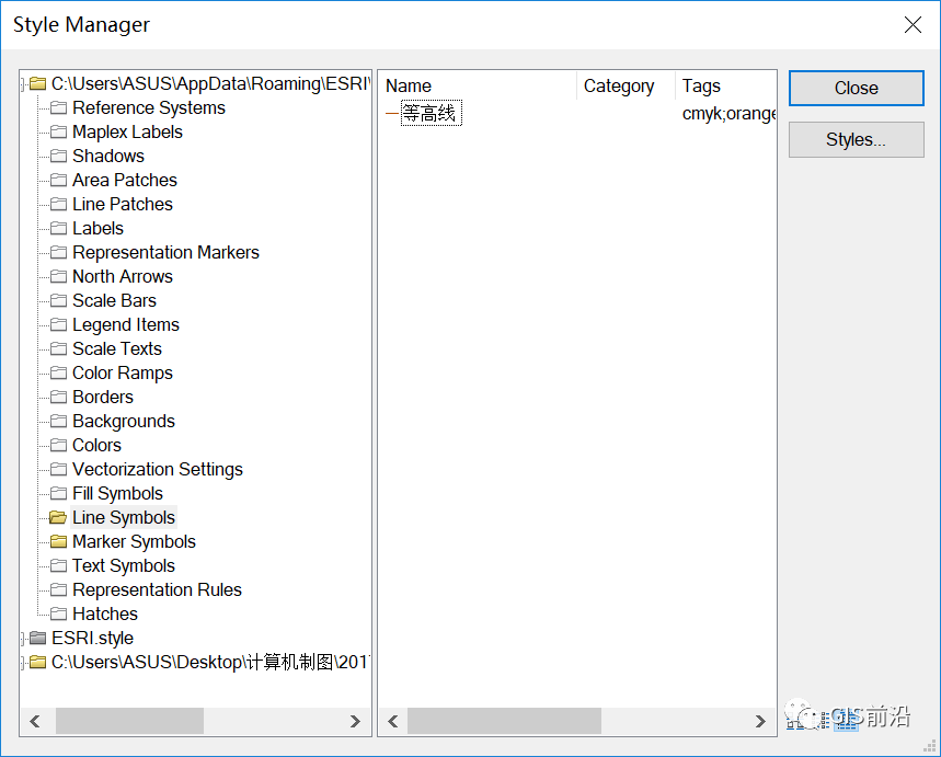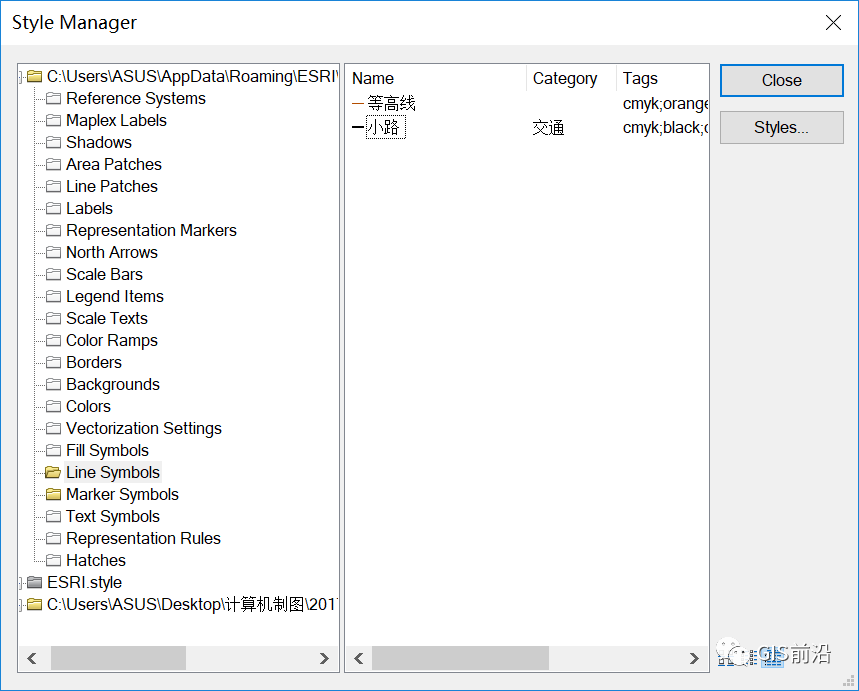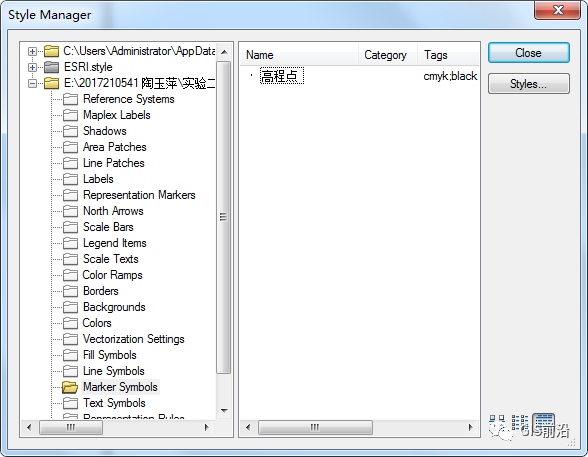 打开ArcMap,点击自定义—样式管理器,在弹出的对话框中查找点击【Styles】,在弹出的面板中选择【Create New Style】,选择保存路径并命名为“地形图符号库”,在Style References面板中将新建的符号库选择【OK】添加到Style Manager中,如下图所示。
