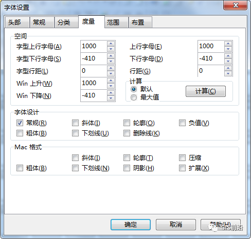 2、点击格式—设置,打开字体设置对话框,在度量页面,空间框线内,分别设置字型上行字母=1000,上行字母=1000,Win上升=1000,其他默认,点击【确定】按钮;