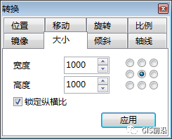 4、绘制导线点字符,在示例字形中选择圆形,并将其拖至字模编辑窗口,按快捷键F6,在转换窗口的大小页面,设置中心位置的宽度=1000,点击【应用】,在位置页面中设置中心位置X、Y位置都为500,点击【应用】,且要锁定纵横比,