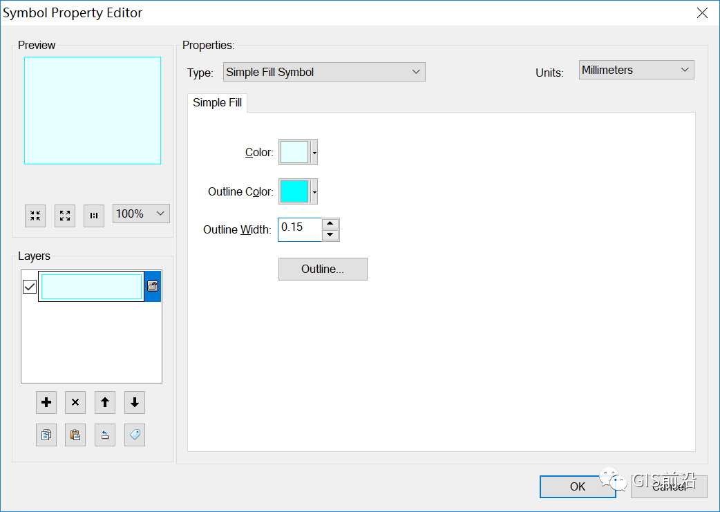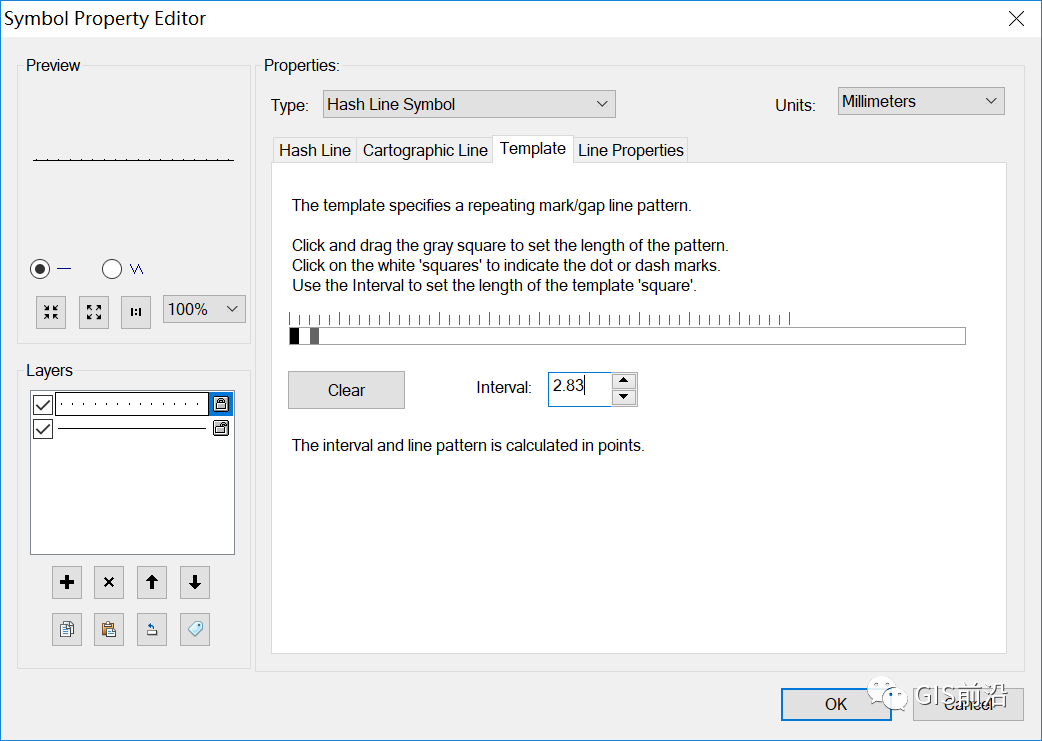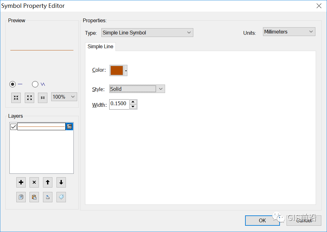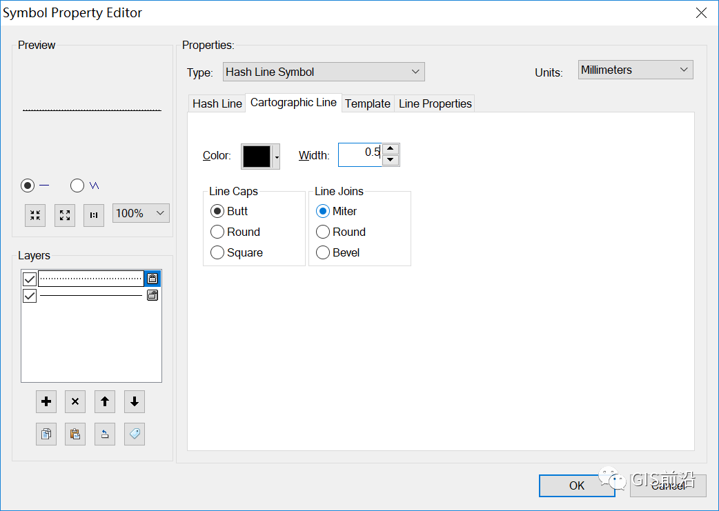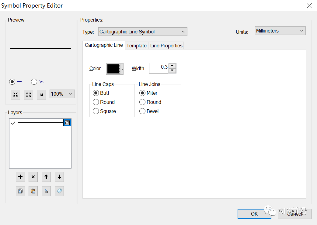 2、设置类型为【Catographic Line Symbol】,颜色为K100,单位为毫米,线宽为0.3mm;