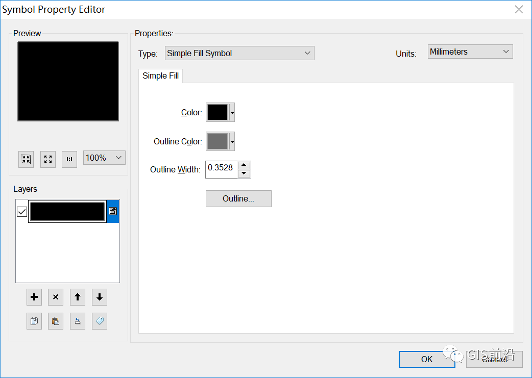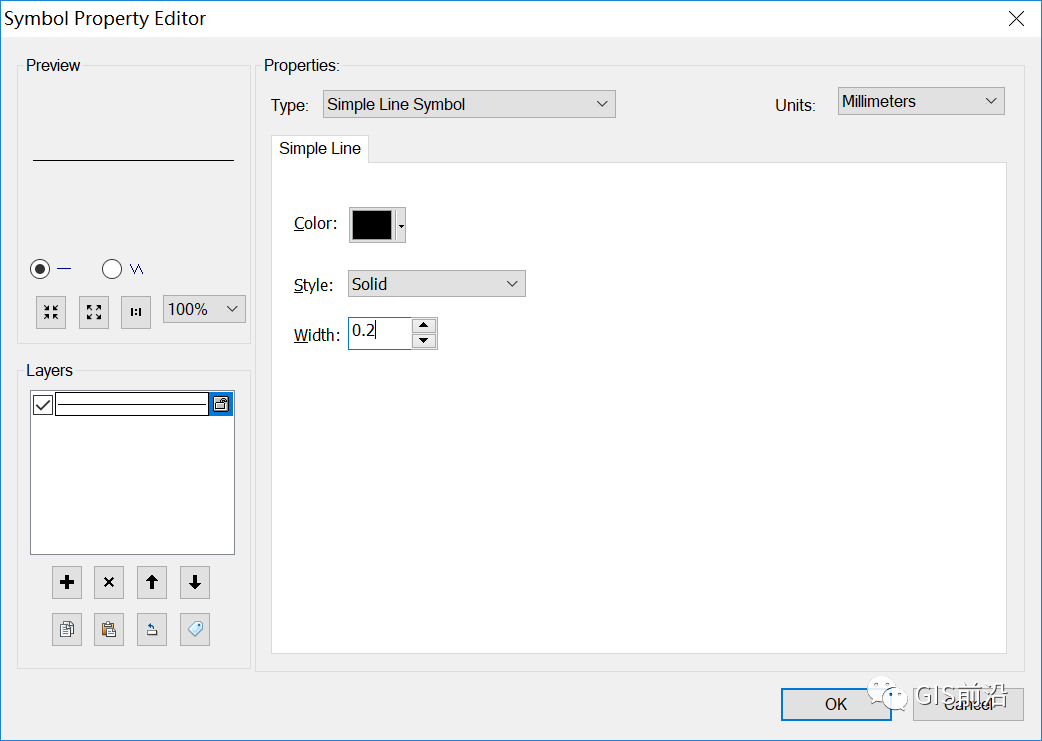 1、新建线符号,设置线符号类型为“简单线符号”,设置颜色为K100,设置样式为“实线”,设置线宽为0.2;