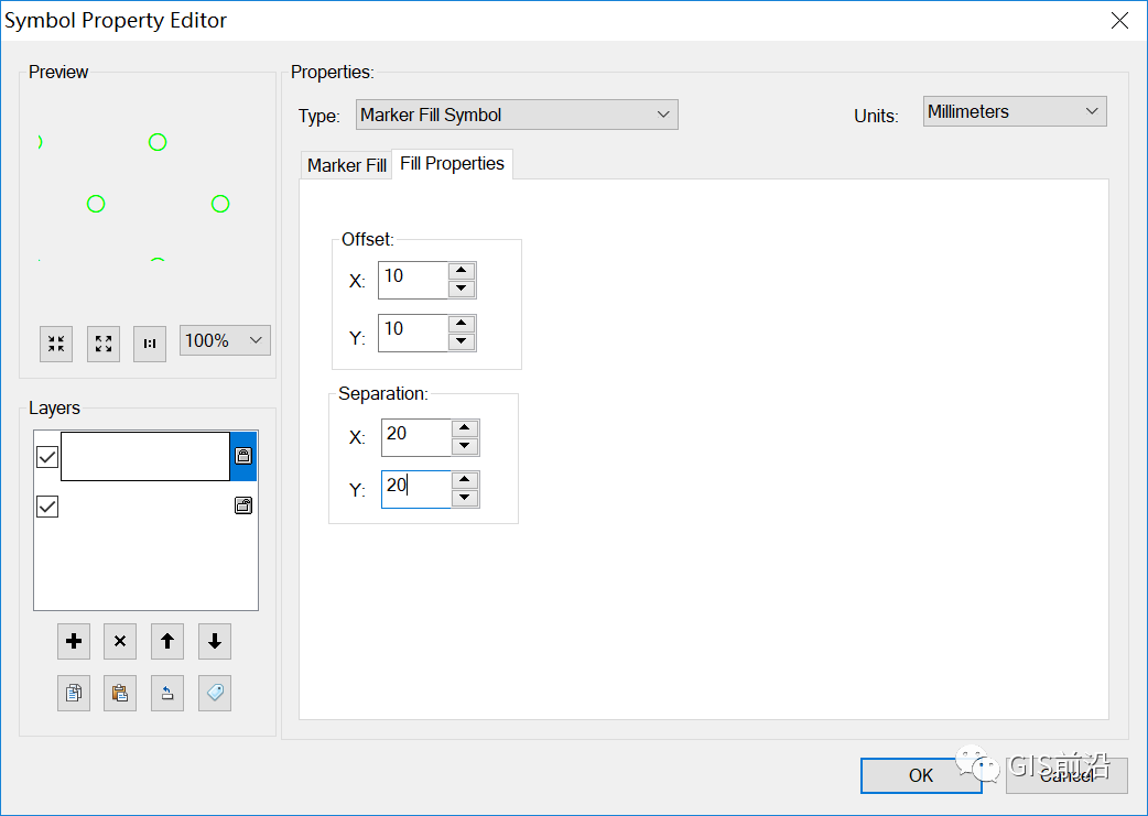 3、在填充属性页面,设置间隔为 20*20,复制图层,粘贴图层,修改偏移量为 10*10,切换至标记填充页面,设置轮廓线,设置轮廓线为“地类界”,修改轮廓线颜色为“C100Y100”,点击【确认】,完成轮廓线的设置,点击【OK】即可。