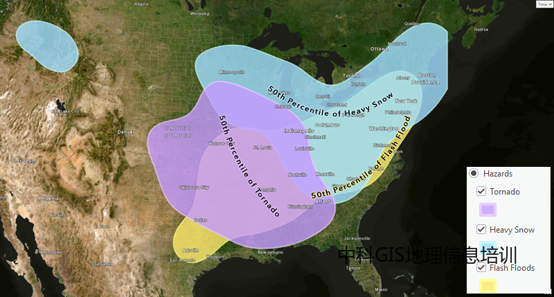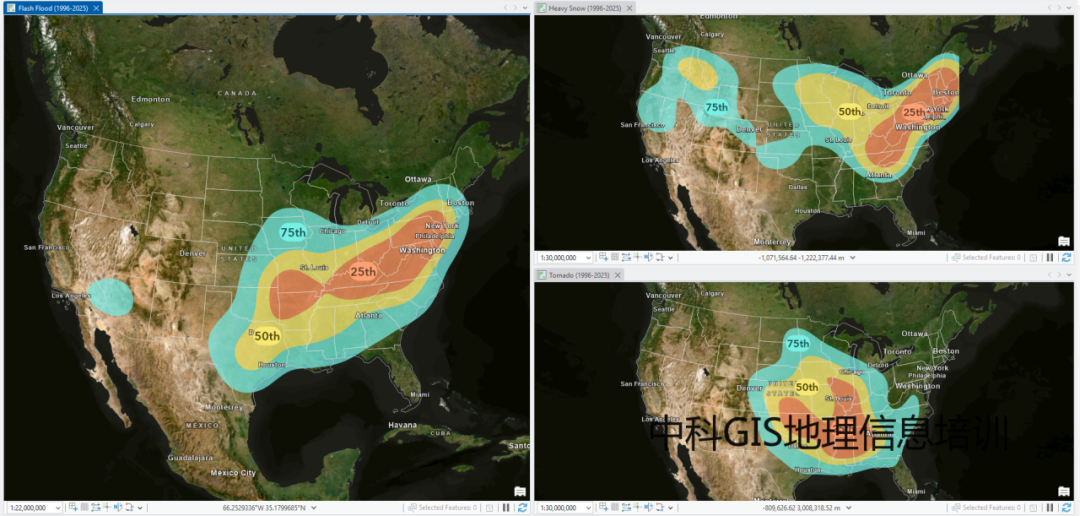 当山洪暴发、暴风雪和龙卷风的第 50 百分位等高线叠加时,重叠区域立即可见。这些地区不仅暴露于一种危害,而是多种危害强度显著。这种洞察难以通过传统制图获得,但在应急管理、基础设施规划和长期韧性战略中极为脆弱。