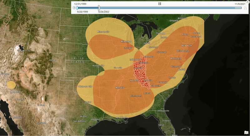 在现实世界中,危险不是静态的,景观也不是静止的。气候模式发生变化,土地利用变化,种群分布也在演变。该项目通过分析三年间隔的危害密度等高线,纳入了时间计算。本分析使用空间时间核密度工具完成。然后从每个切片中计算出第 50 百分位体积轮廓,针对三种不同危险,每隔三年。这一时间视角揭示了那些长期反复暴露于多种危害的县。持续处于百分位轮廓重叠的领域成为优先干预的明显候选对象。在此分析步骤中,使用了额外的数据管理工具,如合并 、 计算重叠要素 、 添加字段 。