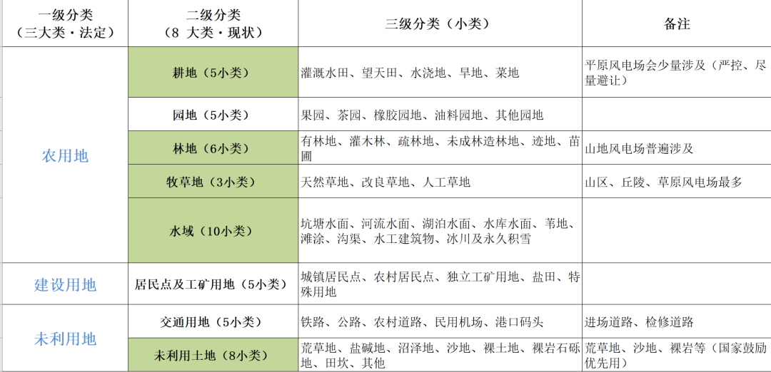 在之前的《风电项目建设用地费有哪些?(按照费用类型划分)》、《风电项目建设用地费有哪些?(按照土地性质划分)》里介绍了土地费用。很多网友对于土地分类还是比较困惑,山地的风电大家可以比较熟悉,会占用林地;丘陵地区的风电会占用林地、草地等;平原项目会涉及耕地、鱼塘等……到底这些地分别都涉及什么费用,又是哪个部门去管?从土地角度和费用角度能不能出一张清晰的表,让大家看得一目了然?小编一直在努力中……今天先来打个底,介绍一下土地类型(以自然资源部资料为基础)。根据最新修订的《土地管理法》(2019年8月26日修订,2020 年 1 月 1 日施行,现行有效),我国土地分为三大类,即农用地、建设用地和未利用地。《土地管理法》定义:"农用地是指直接用于农业生产的土地,包括耕地、林地、草地、农田水利用地、养殖水面等;建设用地是指建造建筑物、构筑物的土地,包括城乡住宅和公共设施用地、工矿用地、交通水利设施用地、旅游用地、军事设施用地等;未利用地是指农用地和建设用地以外的土地。 大家注意,这大三类的定义暂未更改,所以现在很多规定、常用语,还常离不开这三种分类。小编从工作以来,基本上也是沿用了这个分类,下图供大家参考。在第三次全国国土调查(以下简称“三调”,第三次全国国土调查于2018 年 9 月启动,以2019 年 12 月 31 日为统一标准时点,2020 年全面完成,2021 年 8 月公布主要数据成果,整个调查工作历时 3 年)工作中,自然资源部从统一国土调查分类标准着手,在原国土资源部制定的《土地利用现状分类》(GB/T 21010-2017)基础上,形成了《第三次全国国土调查工作分类》,统一了各类土地的分类标准。现在关于用地的工作,出现频率最高的就是“三调图”了!2023年11月,自然资源部围绕“多规合一”、多标准统一,多角度综合确定地类认定唯一性原则,结合自然资源调查监测、国土空间规划编制及“三区三线”划定、国土空间用途管制、耕地保护监督、自然资源开发利用、用地用海审批和执法监管的实际需要,正式印发了《自然资源部关于印发〈国土空间调查、规划、用途管制用地用海分类指南〉的通知》(自然资发〔2023〕234号,以下简称《用地用海分类指南》),统一解决了以往调查、规划和用途管制在不同阶段采用不同标准所带来的一系列管理问题。按照新的【用地用海分类】,用地用海分类采用三级分类体系,共设置24 个一级类、113 个二级类及 140 个三级类。大家可以自行在官网搜索获取,我这里就不贴图展示了,实在是分得很详细很多了,不如之前的直观明了。但是我们习惯上还是在一级类目以上,习惯用农用地、建设用地和未利用地三类地区分,因为从土地的管理方式和程序上、性质上还是这三大类。我在《风电项目建设用地费有哪些?(按照土地性质划分)》一文中,也和大家按照这三类的思路来的。后续会针对风电项目的用地,从24个一级类里给大家挑重点,谈谈用地方面实操和案例,让大家对于这些地类有一个直观的认识。比如:风电的永久用地能不能使用园地?也是可以的,但是少量!