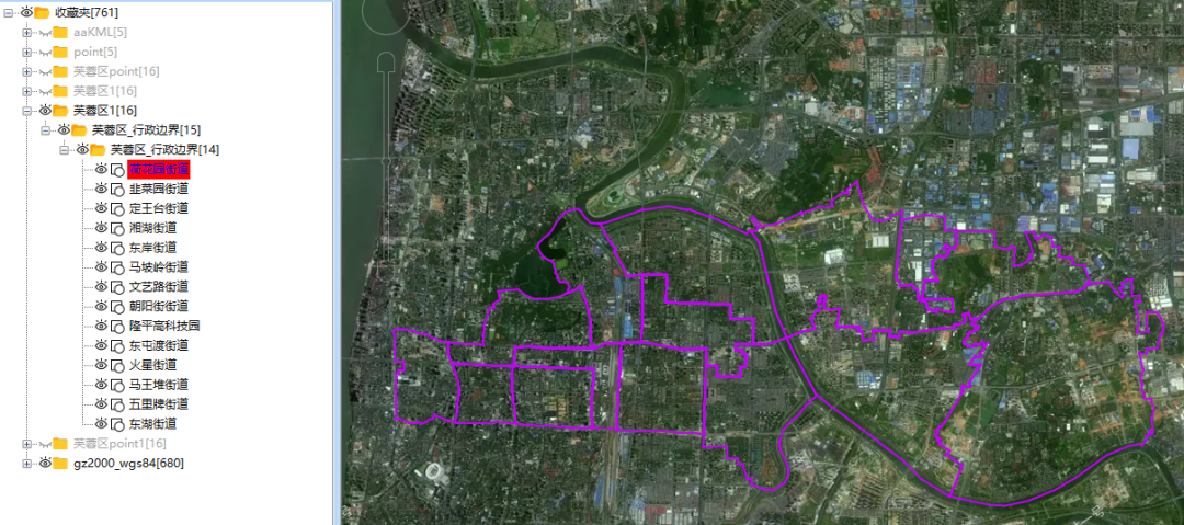 1、加载相应的行政区划kml数据或者利用系统自动的区划数据也可以。本次演示实用了湖南省长沙市芙蓉区的乡镇街道数据。