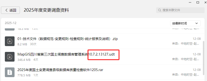 b、之前电脑已安装2024年版本软件,下载群文件夹“2025年度变更调查资料”中“MapGIS四川省第三次国土调查数据库管理系统10.7.2.13127”的UDT文件进行更新,然后下载群文件夹中最新UDT文件进行最新版本更新即可。