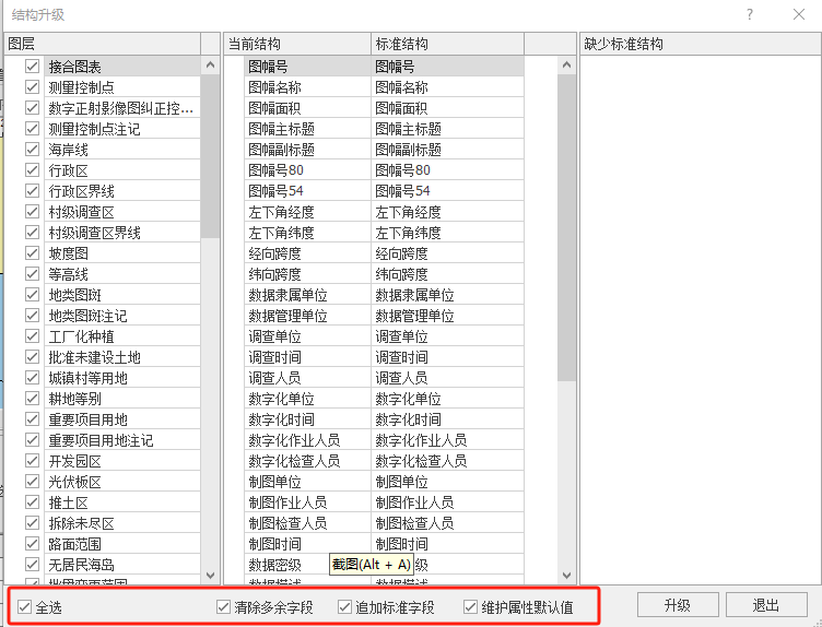 解决方法:将所有图层进行数据库结构升级功能操作,建议按照如下勾选。