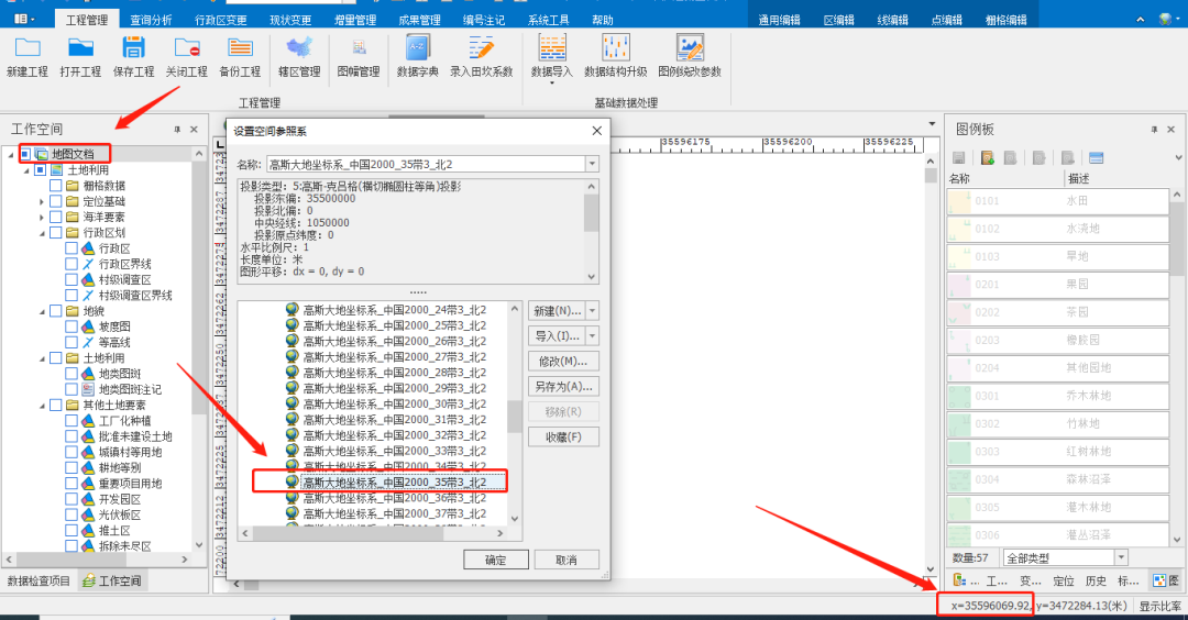 解决办法:1)工程打开,点工具箱里“统计图层参考系”工具。检查数据参考系要和数据是否对应一致。35带3_北2是带带号的数据参考系。2)参考系存在问题的可在工程上右键统改参照系。