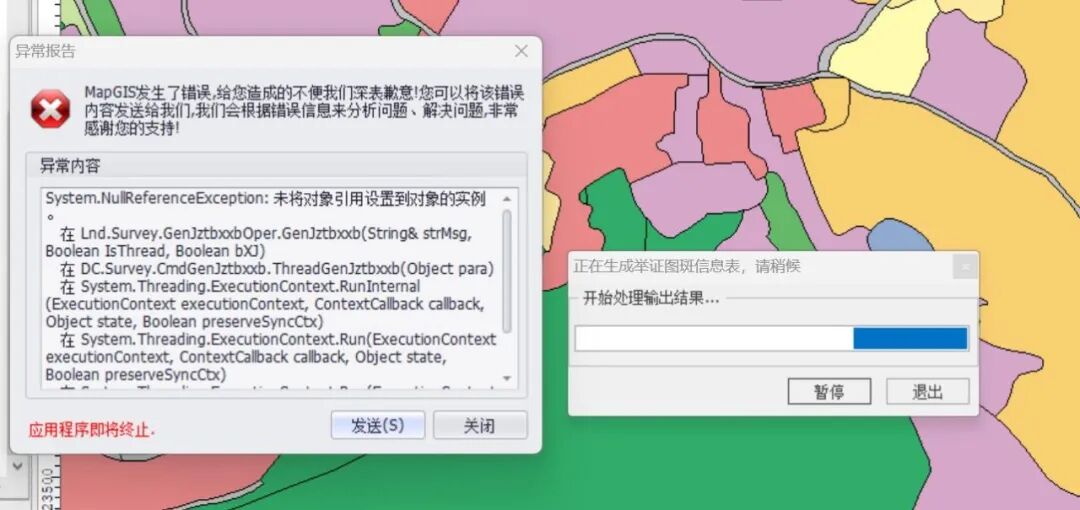 解决方法:1)确保软件已更新到最新版本; 2)举证的图斑范围转成mapgis格式,选择“举证图斑”时用mapgis格式数据图层;3)选择“举证图斑”前进行下数据结构升级;4)输出的路径放盘根目录下。输出过程不要去调用、动用数据。