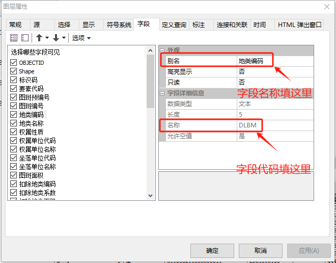 解决方法:按照测试图层字段名称不正确。按照国土变更调查技术规程(2024年度适用)中“表D.4 日常变更矢量结构表”建立日常变更矢量数据图层数据结构(DLTBGX层增加是否实测田坎、项目名称、项目编号等字段即可),注意建字段时字段名称要用英文即规程上所列的字段代码,不能将字段名称和字段别名搞反,不然无法读取字段,会质检检查项失败。如下图。