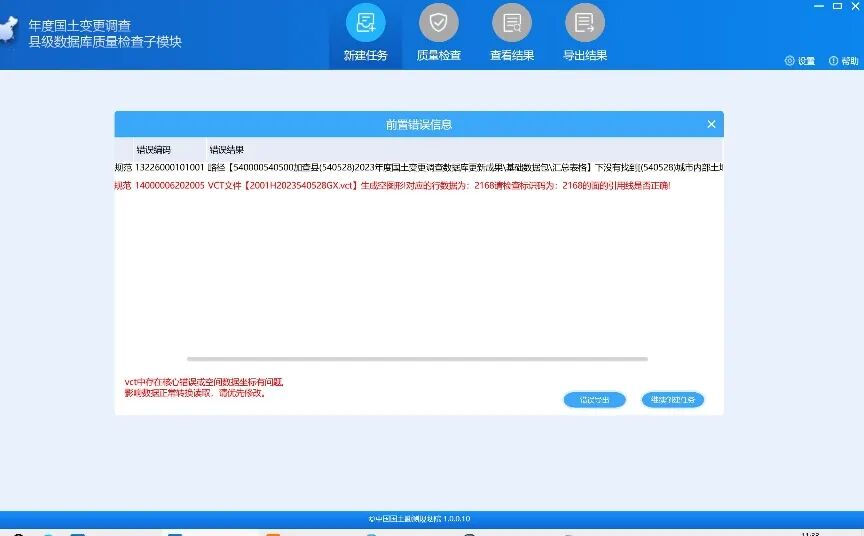 关于只剩一览表错误的“土地变更一览表错误处理工具”工具的操作:建库导增量生成质检全套成果——过质检(报错只剩一览表错误)——用过质检的质检任务质检结果路径去用工具生成新的表格——用新的表格替换原来建库软件建库导增量生成的过质检的增量表格再去过质检——质检后仍报错(报错只剩一览表错误)用新的质检任务质检结果路径再去生成新的表格——用新表格替换上一次过质检的增量表格再去过质检。一览表错误较多的可能需要反复进行此操作。