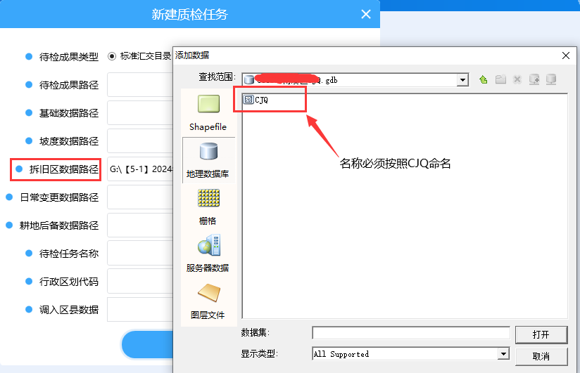 解决方法:质检软件导入拆旧区数据时,名称必须命名为:CJQ。如下图: