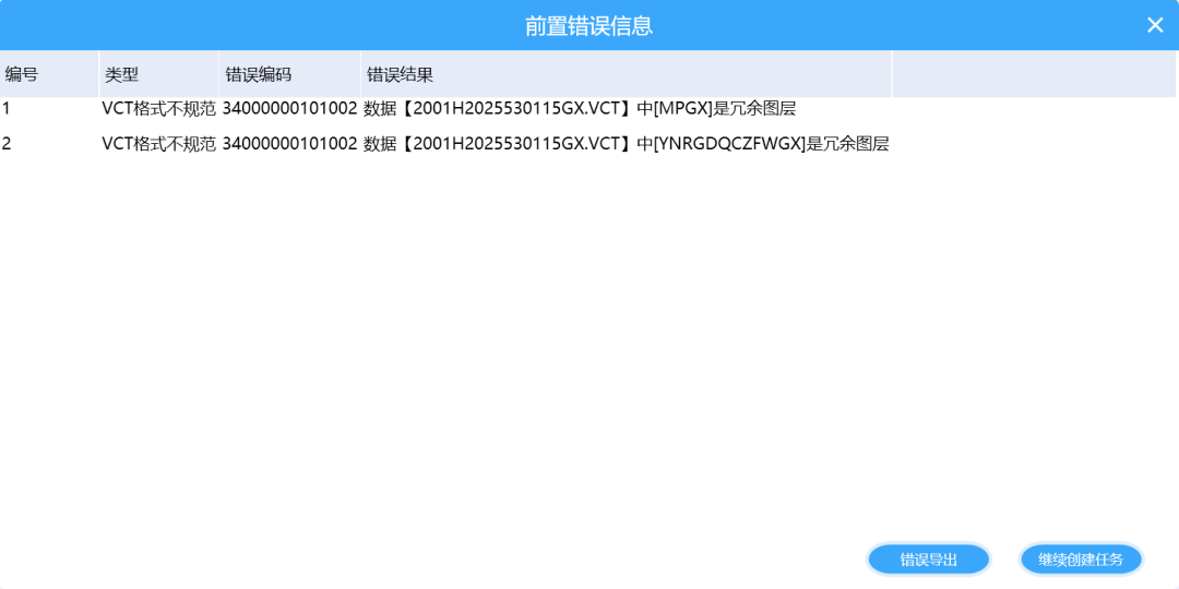 13、VCT格式不规范 34000000101002 数据【2001H2025530115GX.VCT】中[MPGX]是冗余图层;VCT格式不规范 34000000101002数据【2001H2025530115GX.VCT】中[YNRGDQCZFWGX是冗余图层。