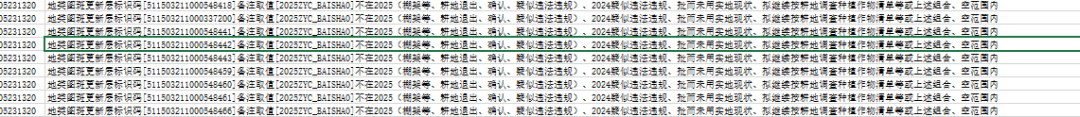 10、地类图斑更新层标识码[]备注取值[2025ZYC_BAISHAO]不在2025(棚架等、耕地退出、确认、疑似违法违规)、2024疑似违法违规、批而未用实地现状、拟继续按耕地调查种植作物清单等或上述组合、空范围内。