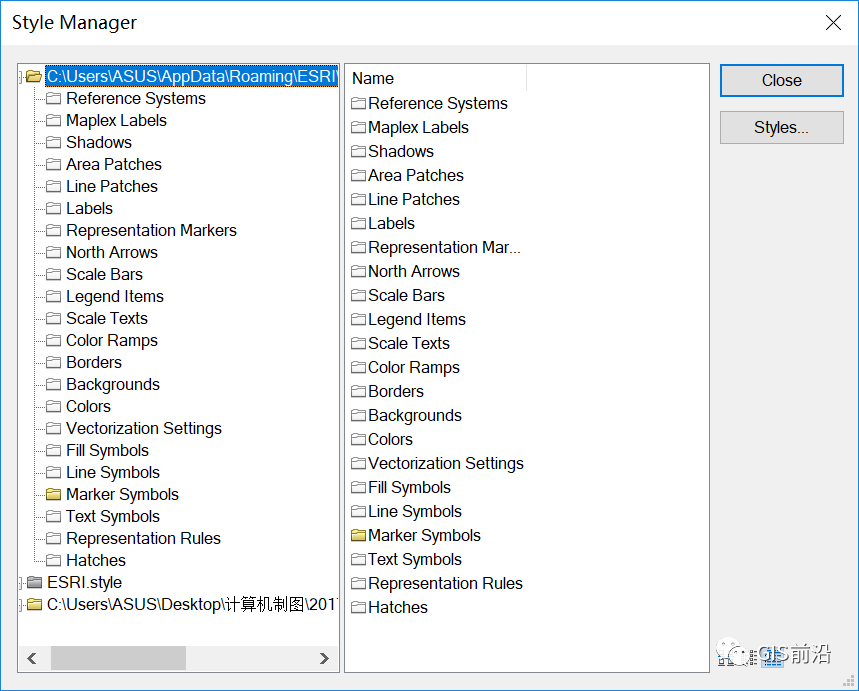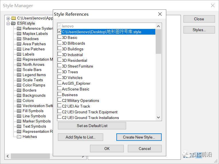 打开ArcMap,点击自定义—样式管理器,在弹出的对话框中查找点击【Styles】,在弹出的面板中选择【Create New Style】,选择保存路径并命名为“地形图符号库”,在Style References面板中将新建的符号库选择【OK】添加到Style Manager中,如下图所示。