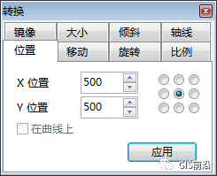 4、绘制导线点字符,在示例字形中选择圆形,并将其拖至字模编辑窗口,按快捷键F6,在转换窗口的大小页面,设置中心位置的宽度=1000,点击【应用】,在位置页面中设置中心位置X、Y位置都为500,点击【应用】,且要锁定纵横比,