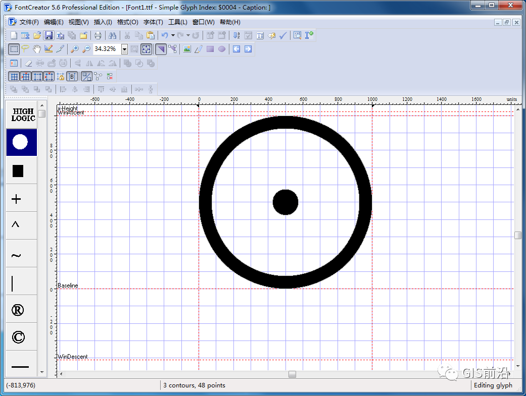 4、绘制完成后,隐藏底图,利用截图工具,将截图复制粘贴到FontCreator上去,设置格式,点击【完成】;