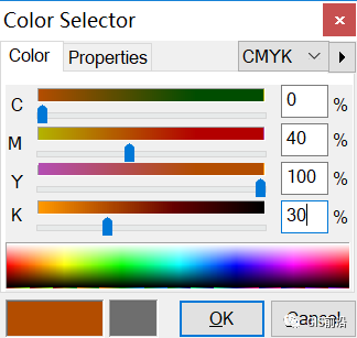 (4)在颜色选择器上设置色彩空间为“CMYK”,颜色值为“C0M40Y100K30”;