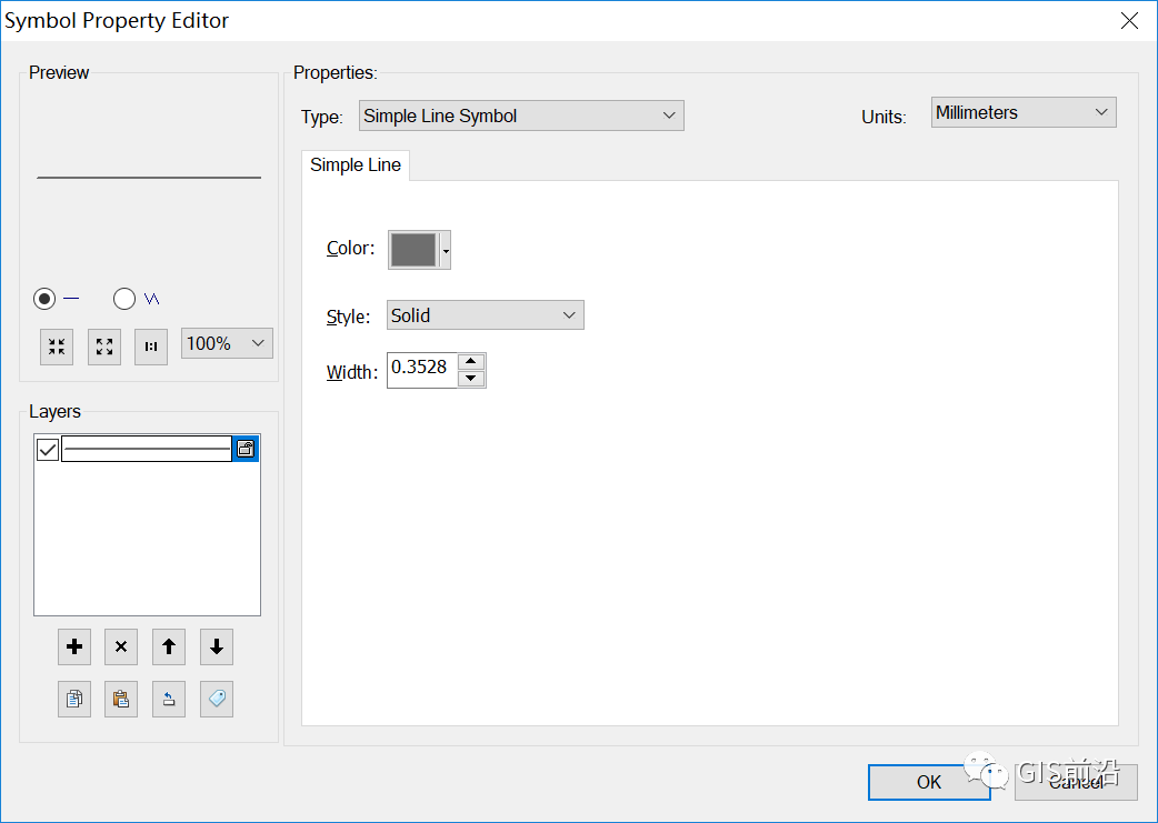 1、新建线符号,设置线符号类型为“简单线符号”,设置颜色为K100,设置样式为“实线”,设置线宽为0.2;