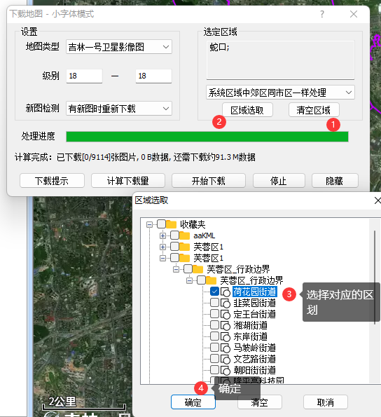 3、如下步骤,清空已有区域,点击区域选择,选择加载数据的行政区划范围。
